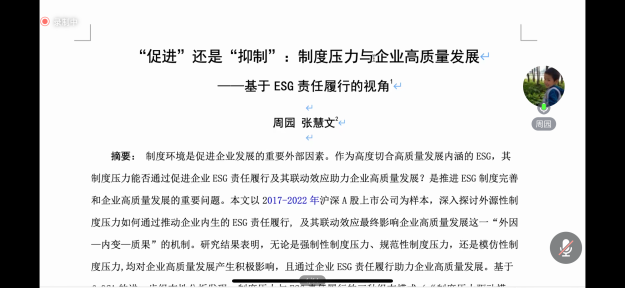 12月7日,91短视频 邀请安徽大学商学院院长周泽将、上海财经大学期刊社责任编辑王孜,以线上会议方式举办“学术论文面对面辅导会”,学院专任教师、学术研究生参加本次辅导。会议由审计系主任吴昊洋主持,91短视频 副教授时军、副教授周园、副教授吴昊洋、副教授胡玮佳分别做学术论文汇报,周园基于ESG责任履行的角度研究了制度压力与企业高质量发展的关系;胡玮佳研究了媒体关注对企业绿色转型的影响;吴昊洋集中于董事联结、管...