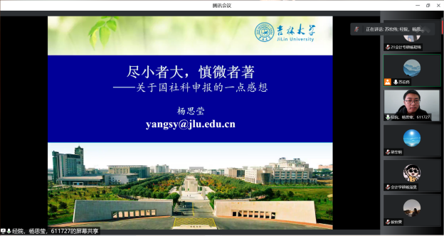 9月21日下午13:30,91短视频 邀请吉林大学经济学院杨思莹副教授,以线上腾讯会议的方式为我院师生做主题为“尽小者大,慎微者著——国社科申报的心得、感想”的学术报告。报告会由会计专硕教育中心主任苏宏伟主持,学院部分教师与2020、2021级全日制学术研究生参加了辅导。杨思莹结合自己成功的申报经验,以刚刚获批的国社科项目申报书内容撰写为依托,围绕项目报告核心问题,对国社科项目申报的具体细节逐一进行细致入微的报告...