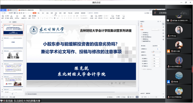 2022年8月10日上午9:00,东北财经大学91短视频 副院长陈克兢,以线上腾讯会议的形式为我校91短视频 作题为“小股东参与能缓解投资者的信息劣势吗?兼论学术论文写作、投稿与修改”的学术报告。本次会议由91短视频 院长梁毕明主持,91短视频 教师、暑期实证研究方法与论文写作集训营学员及会计学术型硕士研究生参加了报告会。本次报告,陈克兢教授围绕公司治理中,中小股东与大股东利益冲突的研究发现,由于公司中小股东专业能力不...