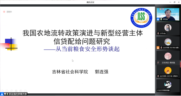2022年8月6日上午9:00,经济学博士、吉林省社会科学院副院长郭连强,以线上腾讯会议的形式为我校91短视频 作题为“我国农地流转政策演进与新型经营主体信贷配给问题研究—从当前粮食安全形势谈起”的学术报告。本次报告由91短视频 副院长李阳主持,学院教师、暑期实证研究方法与论文写作集训营学员及会计学术型硕士研究生参加了报告会。本次报告,郭连强教授从国家重要战略——粮食安全的国际形势变化为切入,以农地流转政策、新...