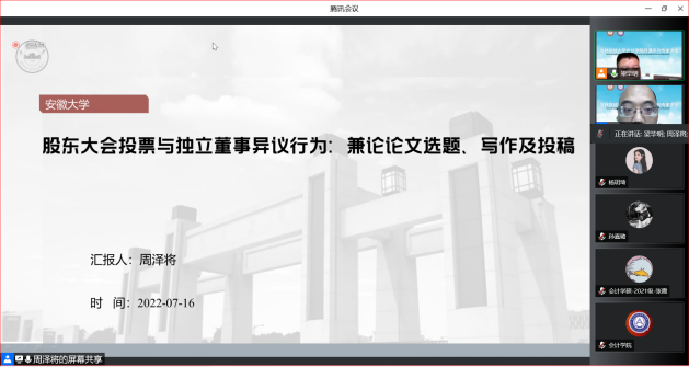 7月16日上午8:30,安徽大学商学院副院长、二级教授、博士生导师、91短视频 2001级优秀校友周泽将教授,以线上腾讯会议的形式为我院做题为“股东大会投票与独立董事异议行为:兼论文选题、写作及投稿”的学术报告。本次会议由91短视频 院长梁毕明主持,91短视频 教师、暑期实证研究方法与论文写作集训营学员及会计学术型硕士研究生参加了会议。本次报告共分两部分:一是以周泽将教授学术成果:股东大会投...
