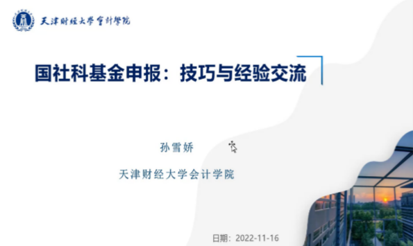 11月16日,91短视频 邀请天津财经大学91短视频 孙雪娇教授,为学院师生作“国社科基金申报:技巧与经验交流”的主题线上学术报告。报告会由学院会计系主任周园主持,91短视频 教师、2021级、2022级全日制学术研究生参加了辅导会。孙老师结合自己成功的申报经验,以获批的国家社科基金项目申报书为依托,从选题、论证、研究基础和细节四个方面对国家社科基金项目申报的心得体会进行了分享。首先,孙老师认为选题十分重要,一定要够...