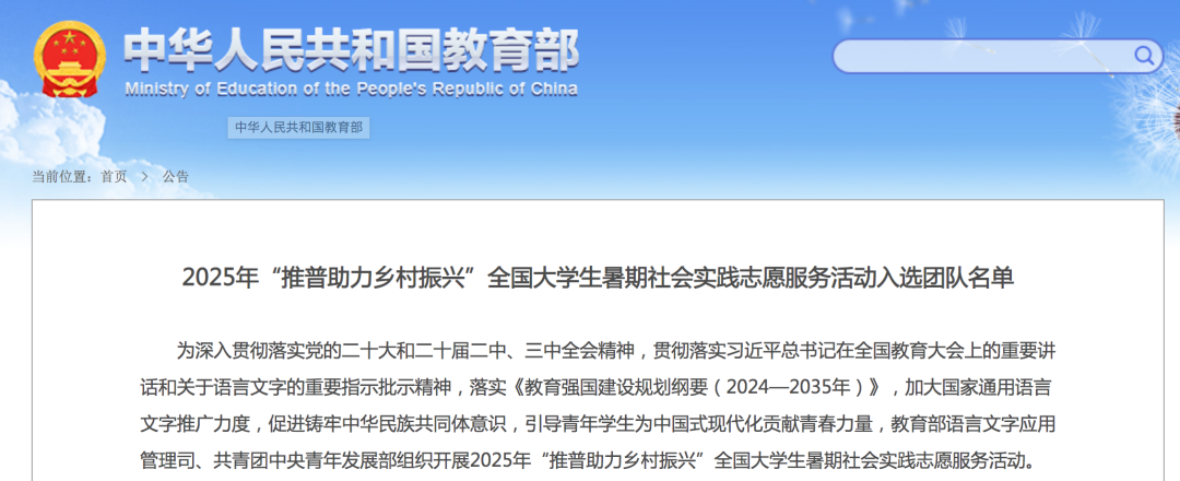 为深入贯彻落实党的二十大和二十届二中、三中全会精神,贯彻落实习近平总书记在全国教育大会上的重要讲话和关于语言文字的重要指示批示精神,落实《教育强国建设规划纲要(2024—2035年)》,加大国家通用语言文字推广力度,促进铸牢中华民族共同体意识,引导青年学生为中国式现代化贡献青春力量,教育部语言文字应用管理司、共青团中央青年发展部组织开展2025年“推普助力乡村振兴”全国大学生暑期社会实践志愿服务活动。