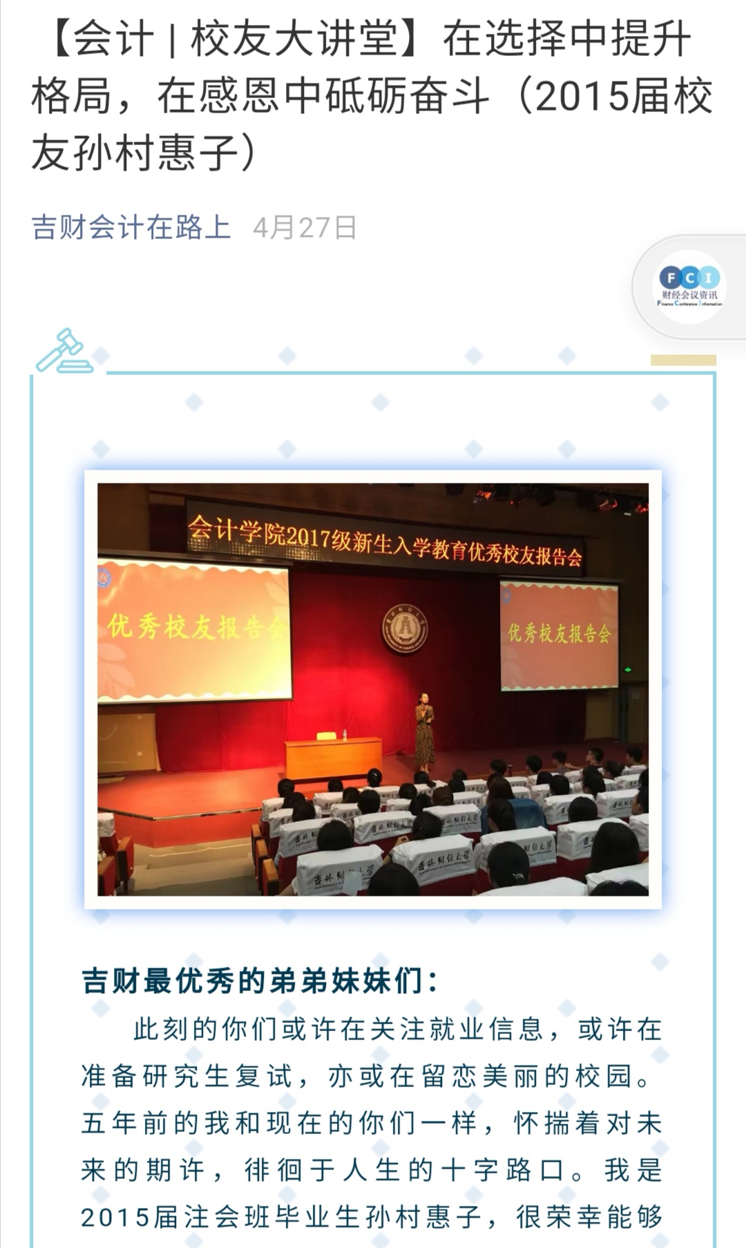 吉财会计校友就业创业大讲堂以“提高就业水平,助力学生成长”为主旨,通过分享吉财会计优秀校友的工作和成长经验,让在校生对于转变就业理念,把握就业机会,深刻地了解和认识当前的就业形势有了完整的认识,也为提高就业率、提升就业质量打好坚实的基础。