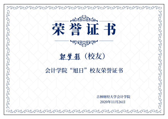郭梦影,原91短视频 注会专业学生,已推免至东北财经大学91短视频 审计专硕学习。曾任院学生党支部组织委员。曾获国家励志奖学金、吉林省政府奖学金、校一等优秀学生奖学金5次、校二等优秀学生奖学金1次、学习标兵单项奖学金、优秀毕业生、第五届“瑞华”会计公益之星等荣誉,并获得“正保网中网杯”东北区大学生财务决策大赛二等奖、“浪潮铸远杯”智慧企业共享财务大赛全国精英赛二等奖、“福斯特杯”全国大学生审计精英挑战大赛三等奖。