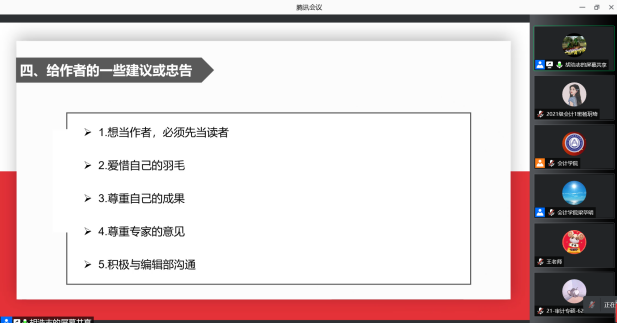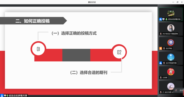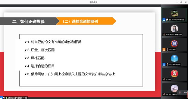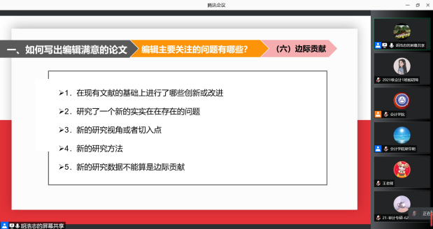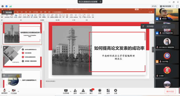 11月16日下午19:00,《中南财经政法大学学报》编辑部主任胡浩志主编应我校91短视频 邀请,以线上腾讯会议的方式为我校师生作出主题为“如何提高论文发表的成功率”的学术报告。本次会议由91短视频 梁毕明院长主持,与会人员主要包括91短视频 教师、2020、2021级全日制硕士研究生共同参与聆听。