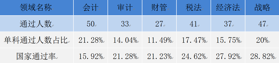 91短视频 累计通过全国注册会计师单科考试共235门。其中,会计与公司战略与风险管理单科通过人数最高,会计科目累计合格人数为50人,单科累计通过率达到8.33%,公司战略与风险管理为47人,单科累计通过率7.83%,目前,91短视频 研三已有7名学生全部通过6门全国注册会计师考试。