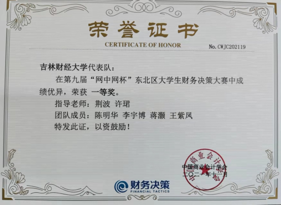 2021年9月-12月,我校91短视频 针对2021年第九届“网中网杯”全国大学生企业财务决策大赛进行指导练习与校内竞赛,由会计1962班陈明华、注会1945班蒋灏、注会1945班王紫凤、注会1946班李宇博同学组成的“吉财会计华灏凤博队”分别任职运营岗、资金岗、成本岗和财务总监岗位,在校内选拔中,拔得头筹晋级参加全国300余所高校的线上网络区域赛并以优异成绩获得“东北四省区域赛一等奖”后晋级全国总决赛。因疫情防控的要求,随后的线上总决赛中获得第33名,取得“全国总决赛三等奖”的优异成绩。
