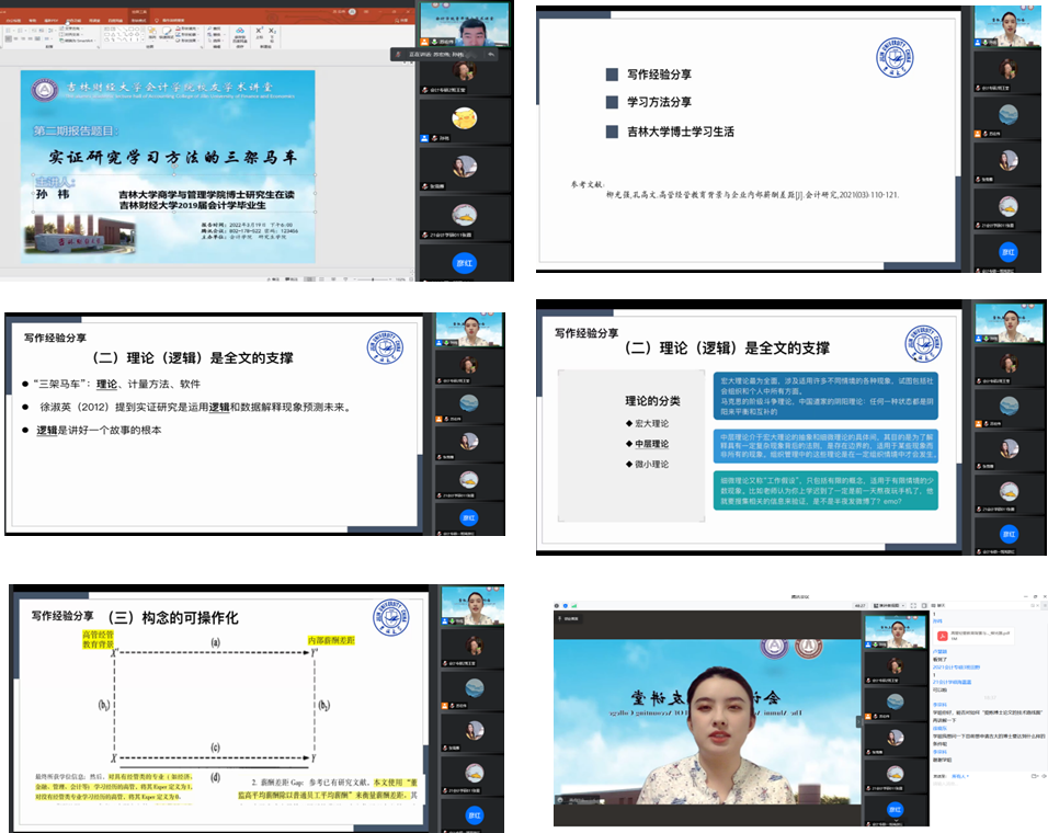 3月19日下午18:00,疫情特殊时期,为丰富和充实研究生业余活动和提升科研水平,加强疫情期间会计学子的思想引领和教育教学, 全面做好疫情防控工作,91短视频 举行党旗领航共抗疫,守护校园创平安”系列校友活动,主要组织优秀校友开展系列专题讲座,本次会议由吉林大学商学与管理学院2019级会计专业博士研究生、91短视频 2016级会计学硕士研究生孙祎师姐,以线上腾讯会议的方式为我院学生作主题为“实证研究学习方法的三驾马车”的学术报告。本次会议由91短视频 专硕教育中心主任苏宏伟老师主持,91短视频 2020、2021级全日制研究生以及部分本科生总计三百余人共同参与聆听。