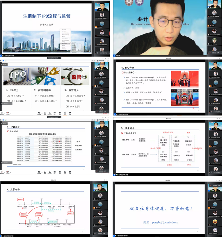 疫情特殊时期,为丰富和充实研究生业余活动和提升科研水平,加强疫情期间会计学子的思想引领和教育教学, 全面做好疫情防控工作,91短视频 举行党旗领航共抗疫,守护校园创平安”系列校友活动,主要组织优秀校友开展系列专题讲座。3月28日下午18:00,由证监会资本市场学院与厦门大学联合培养博士后、东北财经大学会计学博士研究生、91短视频 2016届会计硕士研究生彭博,以线上腾讯会议的方式为我院学生作主题为“注册制下IPO流程与监管”学术报告。本次会议由91短视频 专硕教育中心主任苏宏伟老师主持,91短视频 2020、2021级全日制研究生以及部分本科生总计三百余人共同参与聆听。