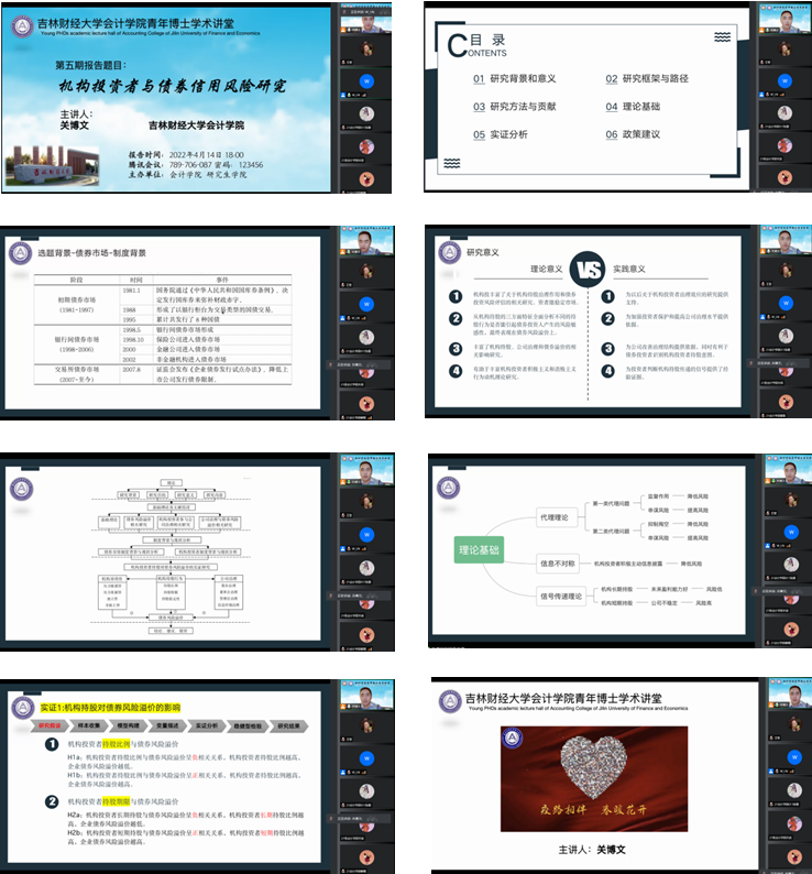 4月14日下午18:00,疫情特殊时期,为丰富和充实研究生业余活动和提升科研水平,91短视频 举行“疫路相伴,春暖花开”党员教师系列导学讲座,主要组织青年博士开展系列专题讲座,本次由91短视频 关博文老师以线上腾讯会议的方式为我院学生作出主题为“机构投资者与债券信用风险研究”学术报告。该次会议由91短视频 副院长王丽南老师主持,91短视频 2020、2021级全日制研究生共同参与聆听。
