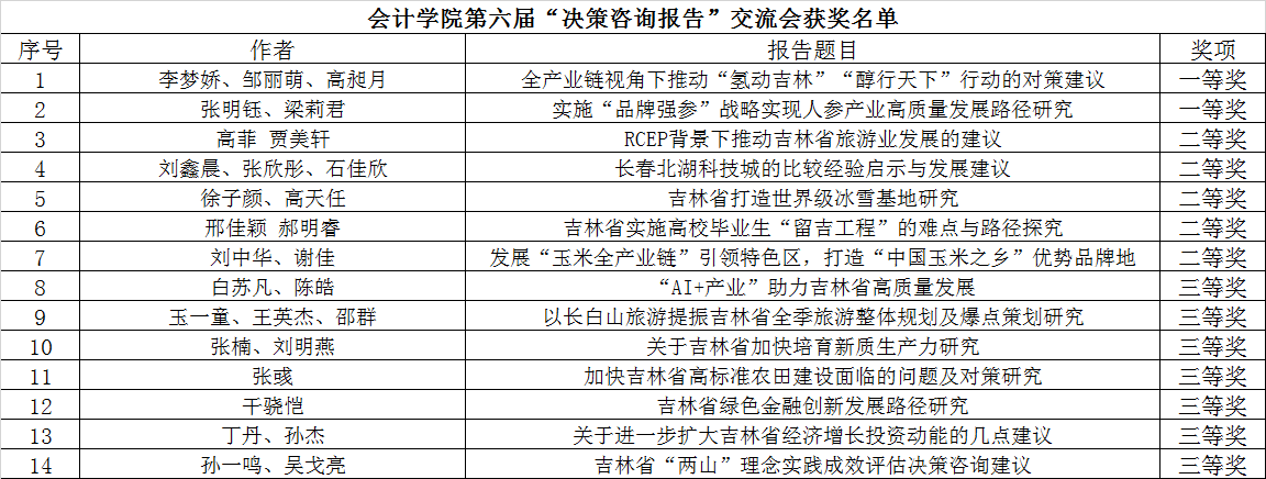 本次交流会共计接收决策咨询报告22篇,通过匿名外审后筛选出14篇决策咨询报告进行交流汇报。经长春市社会科学界联合会刊物编辑部主任李中良、吉林日报社主任记者兼吉林省报告文学委员会秘书长孙翠翠、学校国际经济贸易学院刘兆国教授等评委的现场点评及打分,并综合专家初评分数与现场汇报分数,最终评选出一等奖2名,二等奖5名,三等奖7名。