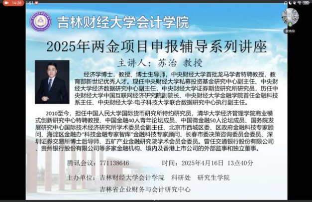 为提升教师科研项目申报质量,4月17日下午,91短视频 举办2025年国家社科基金项目线上申报指导会,邀请中央财经大学苏治教授担任主讲嘉宾,为学院教师开展一对一精准辅导。