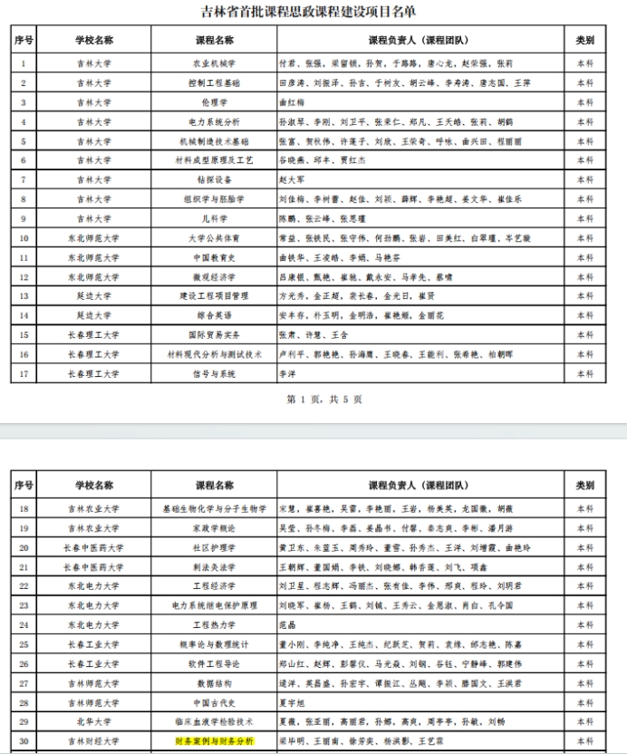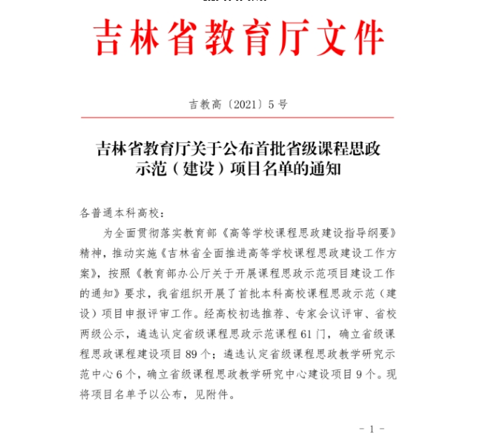 吉林省教育厅发布了《吉林省教育厅关于公布首批省级课程思政示范(建设)项目名单的通知》,遴选认定省级课程思政示范课程 89 门,我院《财务案例与财务分析》获吉林省首批课程思政课程建设项目。