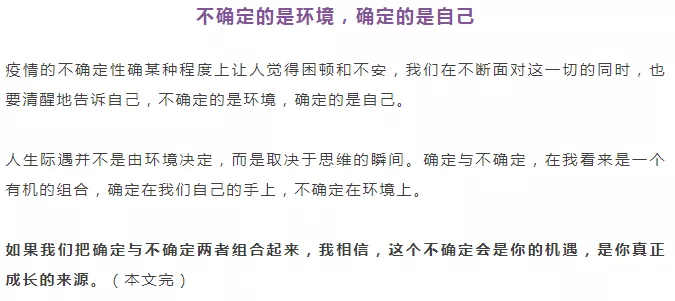 疫情下的不确定性会持续发生,所以我们所需要的,不仅是直面它的勇气,更需要有认知它的能力,与它共处的能力。在《会计研究方法》课程讲授期间,和同学们分享现任北京大学国家发展研究院BiMBA商学院院长、知名管理学者陈春花教授针对疫情撰写的文章《与疫情共处,极速调整认知的四个'方法》,结合课程内容对管理学思想讲解的同时,自然的渗透疫情期间调整认知的科学方法。告诉同学们立于当下,快速调整认知是我们首先需要做出的选择。当我们把认知调整好,就拥有认知危机的能力,知道如何了解危机中的各种知识,知道如何对危机中的信息进行加工,为应对危机打下心理基础。学会与疫情下的不确定性共处,坚定自我发展的信心,不确定的是环境,确定的是自己。提升同学们面对疫情的信心,坚定同学们迎难而上的生活信念。