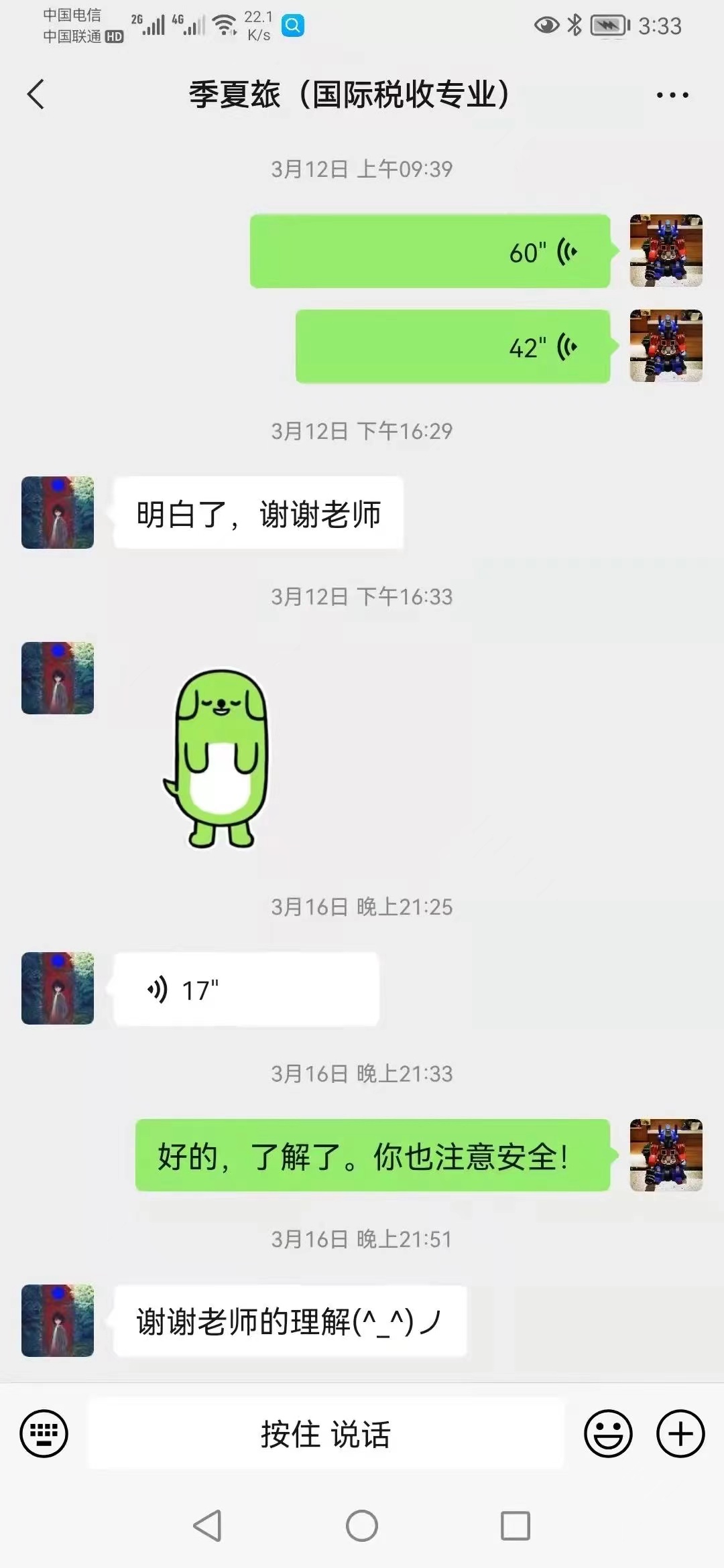 作为一名专任教师,赵老师认为无论面对何种困境,保障高质量的教学效果是人民教师义不容辞的责任,也是教师职业操守的具体体现。考虑到各班防疫志愿者的工作时间可能和上课时间存在冲突,赵老师主动联系各班委,掌握各班防疫志愿者具体名单和工作时间。对于那些确实因防控工作需要缺课的同学,赵老师每周利用个人时间专门为这些同学补课。同时为保证每位同学毕业论文的质量和进度,赵老师有计划地安排针对每一个学生论文的指导,就毕业论文中的具体问题进行线上指导,及时提醒学生参加跨专业实训并随时跟踪校外实训学生的具体进度。