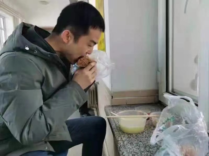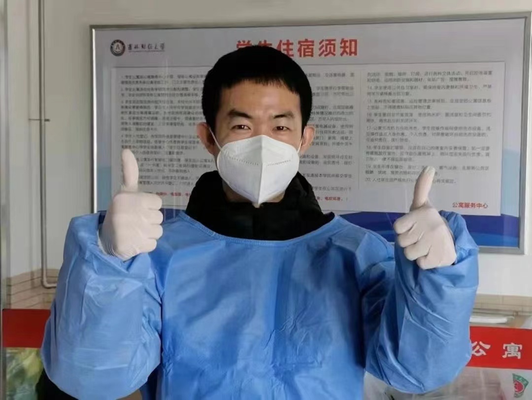 每每见到罗老师,他的身影总是忙碌的,在每日三次运送物资的车辆到来之前,他总是提前等候在一舍楼下,忙着带领志愿者清点搬运物资。罗老师为了减轻志愿者同学的负担,想让六楼的学生第一时间吃上热乎乎的饭,每次他都是一人抬着装有40盒饭的大箱子爬到六楼。物资分发工作完毕后,罗老师并没有休息,而是打开微信督促所带的近600名学生日报打卡,回复学生信息,帮助学生解决问题,至今他所带13个班级的学生日报打卡率和青年大学习完成率依旧是100%。他总是跑上跑下常常忙得顾不上吃饭,有时把自己的饭给没有订到饭的学生,自己却饿着肚子继续奋战在抗疫一线。由于一直吃饭不规律加之高强度的配餐搬运,引起了眩晕和低血糖,但即便是这样他依旧咬牙坚持。在一舍楼下经常会看到罗老师一边用手机回复着学生信息,一边面对着冰冷的窗台几口快速解决失去温度的盒饭。